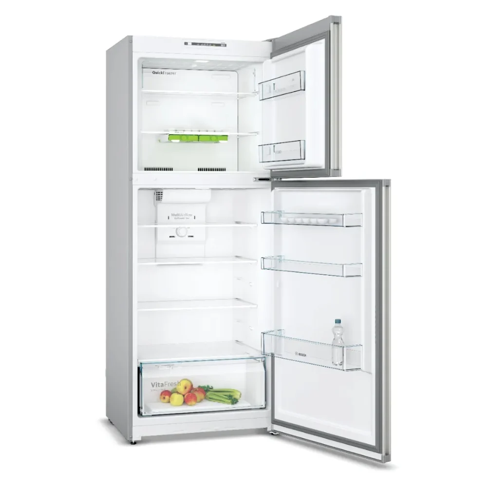 The Bosch KDN43N12N5 Top Mount Freezer Refrigerator (380L, Silver) is built for efficiency, durability, and convenience. Featuring No Frost technology, it eliminates ice build-up and ensures hassle-free maintenance. Its XL freezer compartment offers 30% more space, supported by a powerful inverter compressor with a 10-year warranty for long-lasting performance. With 4-star freezing capability, the unit reaches temperatures as low as -24°C, while Cool Extend technology preserves cooling for up to 30 hours during power cuts. The Super Freeze function and Quick Freezing Zone with included cool packs ensure fresh storage at all times. Inside, the VitaFresh drawer with humidity control keeps fruits and vegetables fresh longer, while LED lighting brightens every corner. Stylishly finished in silver, this Bosch refrigerator combines performance, practicality, and modern design.