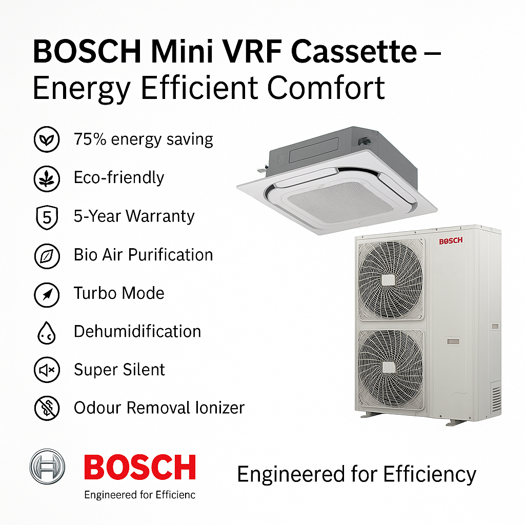The Bosch Mini VRF Cassette (Non-Cascadable) combines compact design with advanced technology to deliver efficient and reliable cooling. Powered by a DC inverter system, it ensures up to 75% energy savings with an outstanding A++ energy class rating, while maintaining whisper-quiet performance. Engineered for durability, it features an anti-corrosion unit and comes with a 5-year warranty for peace of mind. Comfort is enhanced with multiple modes including turbo, dehumidification, and self-service mode, ensuring personalized convenience. For healthier air, the unit integrates bio filters, an active carbon filter, ionizer, and air purification mode—effectively removing odors, particles, and allergens. With SEER 7 and SCOP 5.1 energy efficiency ratings, this eco-friendly system offers outstanding performance without compromising sustainability. The Bosch Mini VRF Cassette is the ideal solution for modern spaces that require discreet, powerful, and energy-conscious cooling.